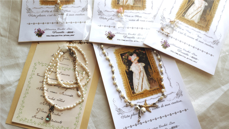 アンティークガラス、アンティークレース、マザーオブパールなど使ってます。