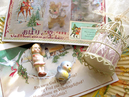 クリスマスカードについてるのは可愛いビスクの女の子、それから小さな青い小鳥さん♪