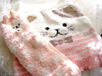右のもこもこふわふわのにゃんこ柄のはおパンツとルームソックスです。