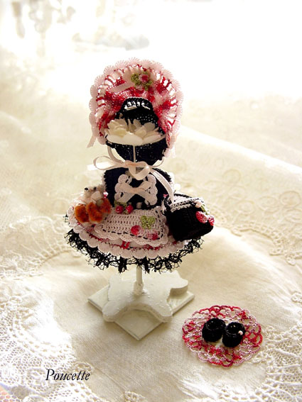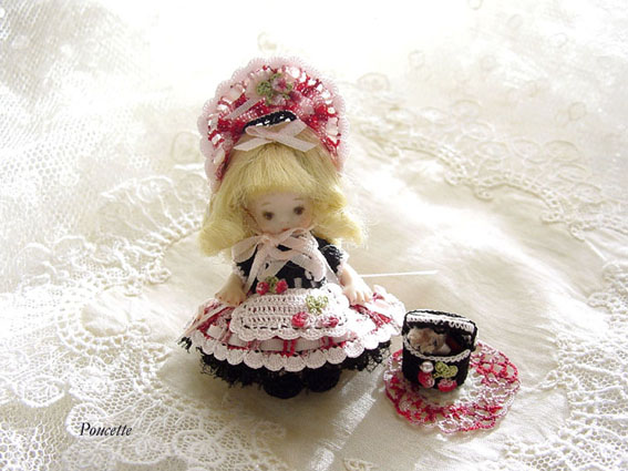 おちびサイズのドレスです。以前編んだちびドラちゃんのエプロンドレスのエプロンより大きめで リボンやフリルがいっぱいのキュートなドレスになってます♪ 一番のお気に入りはこのバニティバッグ、ちゃんと中に小物が入ります(^o^)丿 (上の画像ではミニミニくまちゃんが入ってます)