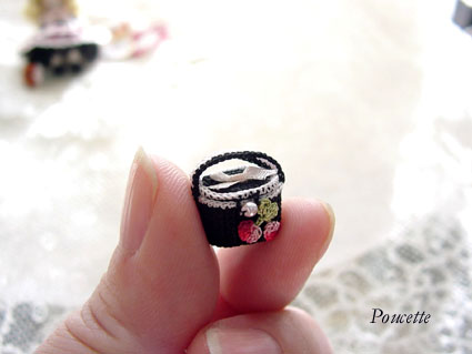 大きさは約1.2㎝×1.0㎝、もち手の部分もピンクと黒の2色使いです。 このバニティバッグ、ドレスを編むよりめんどくさいです。。。