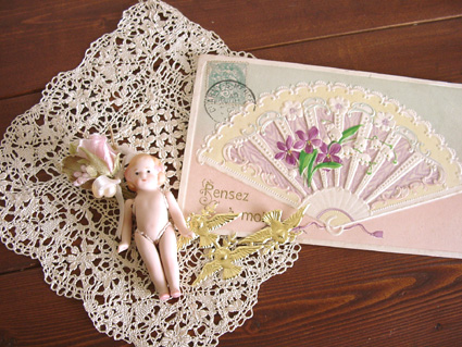 素敵なファンのアンティークのポストカード、スミレとレースのエンボスがとっても綺麗♪